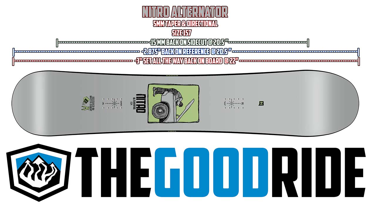 Setback: -20mm @ 22.75” on Sidecut / -2.375” @ 22.75” setback on board