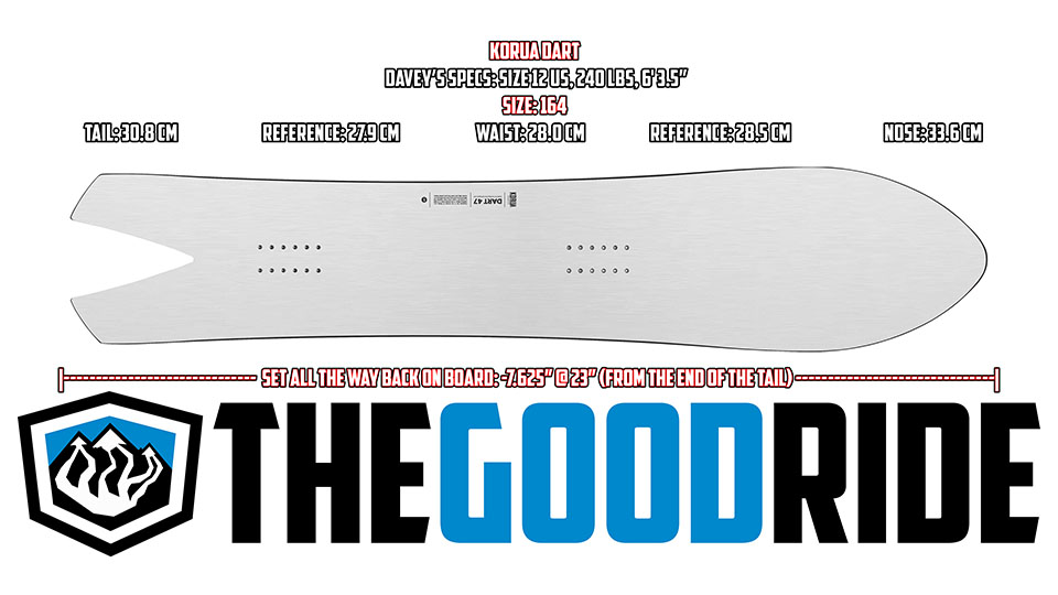 The dart is not just a snowboard; it’s one of my best friends. It’s a true chariot of the gods. Its short swallow tail, ultra nose-up surfy style ride is unique and addictive. It may not be the ideal board for everybody or every day, but when the snow is bottomless, or the groomers are flawless, and you’re out there for the love of the turn, let the dart be the pen that carves your love letter in the snow.