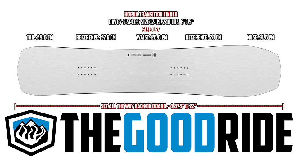 The Korua Transition Finder is such a fun snowboard. This board carves and gets air as good as any other board on this list, but this still has great float due to its setback stance options. The Transition Finder has more tail than all the other Koruas, except the Otto, so there’s a lot of landing gear here. You can set it back for the deepest of days, and then you can center your stance and take this thing on everything from firm groomers to slushy springtime park laps.
