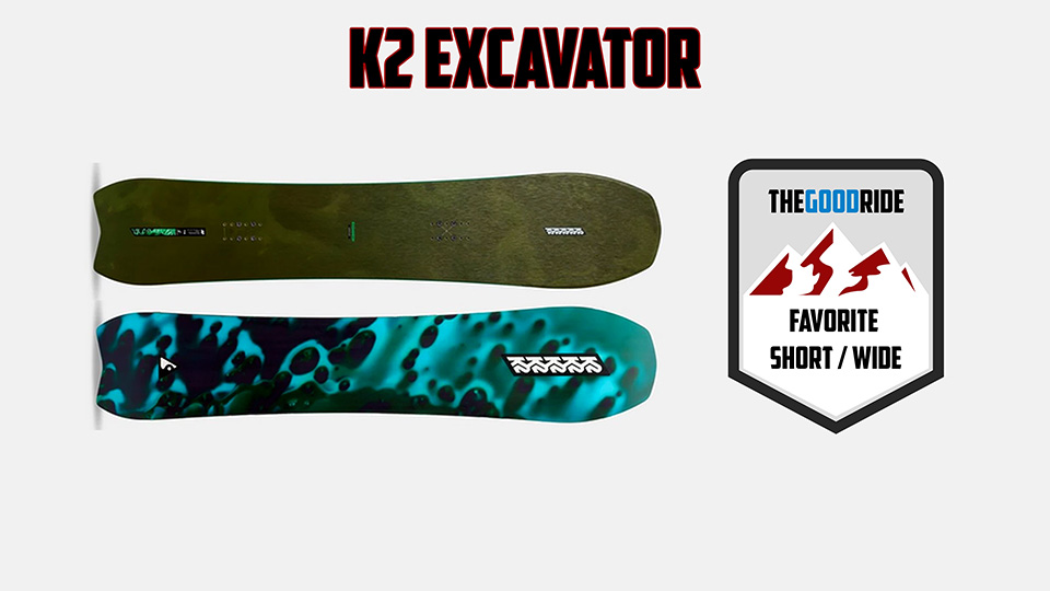 The K2 Excavator is another fun, setback, turny, versatile, do-it-all kind of short wide that I think a lot of people will appreciate. And while it doesn’t have the fastest base, it does hold wax very well, and it’s a very fun board in powder if sized right.  The reason the excavator made the list is that it’s just such an easy board to ride. It doesn’t do any one thing great, but it does everything really well, and I like this lighter, poppier, but not too chattery, construction with K2 versus their damper construction in other models. That is, of course, my personal preference, and if you like really damp boards, then maybe you wanna look at the Almanac when we talk about that later.