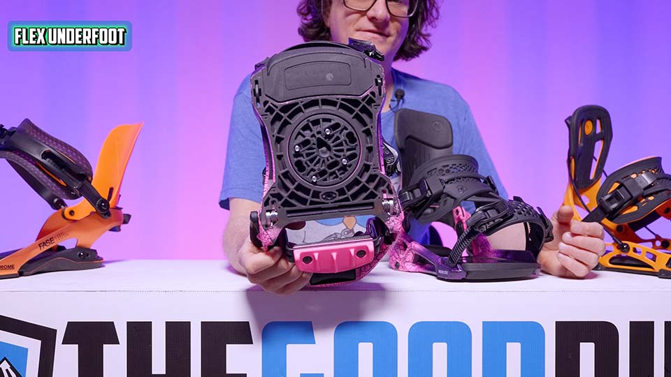 This is stiffer than the OG Supermatic, but it’s still got some twist and give. They put some EVA foam on top, so it’s not as super stiff as the Carbon Supermatics. Compared to the Katana, there is less twist and a little less give, but both have a bit of give, like mid-binding there. Flow’s always weird because it’s hard to truly measure the flex there, where the latch is. But on the sides, there’s a little bit of give, and you feel that twist more when you’re in the binding than what you see here. There’s a little bit of give at the top, but less than the other two for sure.