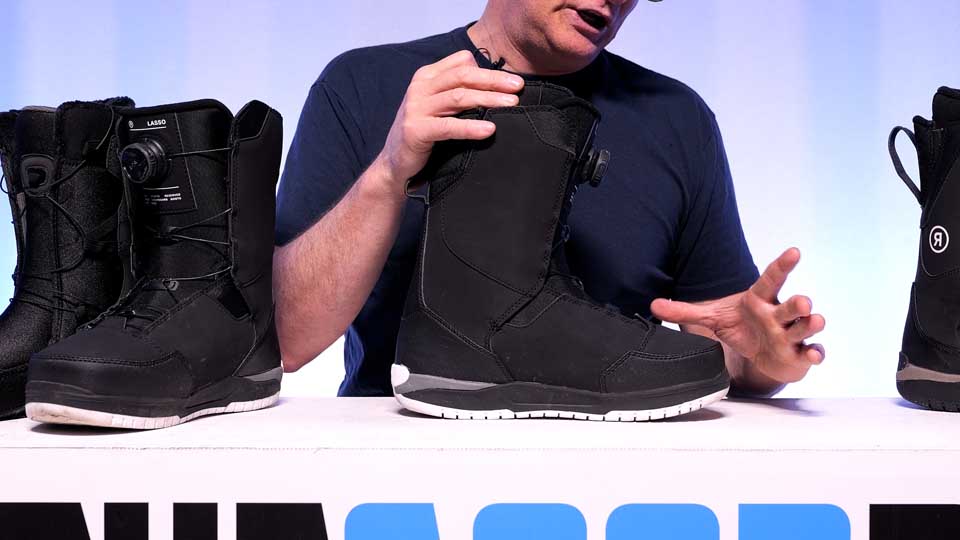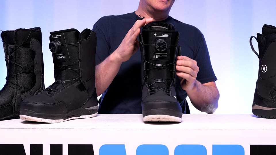The Ride Lasso has a great wrap around the ankle. It's pretty easy on and off. It has better shock absorption than its higher-priced Lasso Pro. Very good traction with an all-rubber sole. It's got a little ankle articulation. It's very comfortable right out of the box. Fits a wide variety of foot widths. However there's no upper and lower adjustability. It's all throughout. That can be problematic for people like me. The flex longevity isn't the best. It's more mediocre. But that's about it.