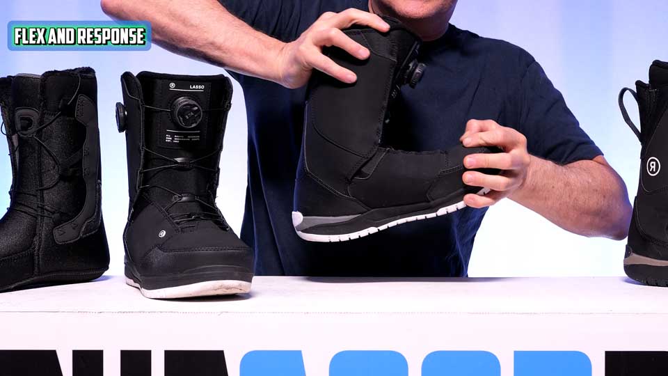 The Ride Lasso is definitely on the medium, bordering on medium-stiff, side when you get it out of the box. But after a week or two of riding, it definitely softens up. The response is pretty good, but over time, it’s going to diminish with the flex. And this articulation helped prevent shell distortion, but I’m starting to see some even after only a few days of riding. 2027 is a lot better with flex retention.