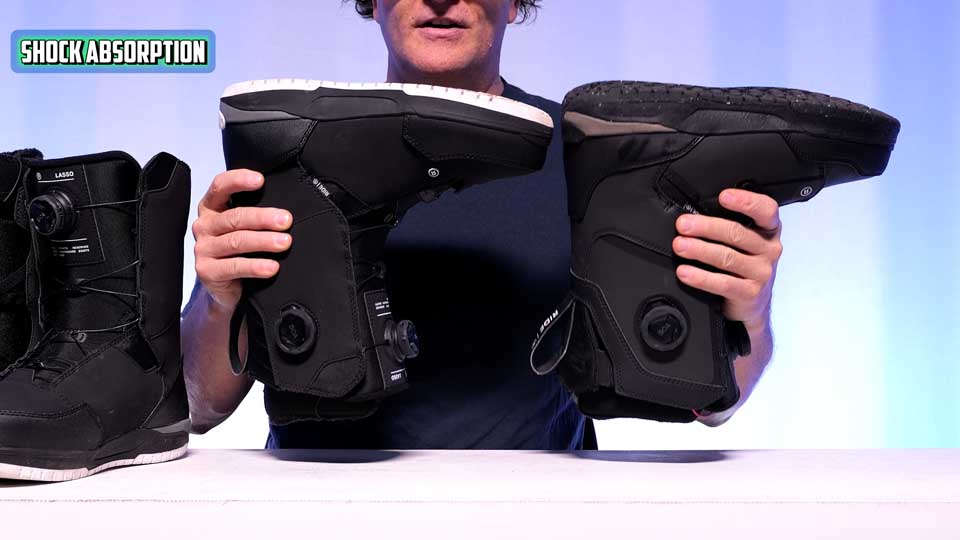 This has a very similar sole and rubber to the deadbolt, and it’s not like the Lasso Pro, which has significantly less shock absorption. It feels very hard in the sole, which is great for board feel, but it’s not good for absorbing shock. This thicker rubber sole gives you a little bit of dampness. And then this light, soft Eva foam gives you good shock absorption. I felt it was almost on par with the deadbolt, which I think is the best in Ride’s line. So I like the sole and the midsole and what it’s doing for shock absorption. There’s pretty good board feel to. I think the stiffer soles of the Lasso Pro, the 92, the Fuse, and other boots like that that have that older design. They have more board feel, but it comes at a very heavy price, and that’s a lack of shock absorption.