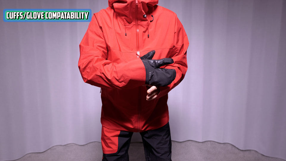 There is a very unique cuff with no Velcro strap tightening system. It just slides over the glove and you don’t get snow stuck to the Velcro. I thought I wouldn’t like this but it didn’t even bother me on the mtn. I think those who like cuff adjustability or ride with their gloves over the cuff might not like this. Since I use this just for the Mtn I found it worked well because I always have my gloves under the cuff.