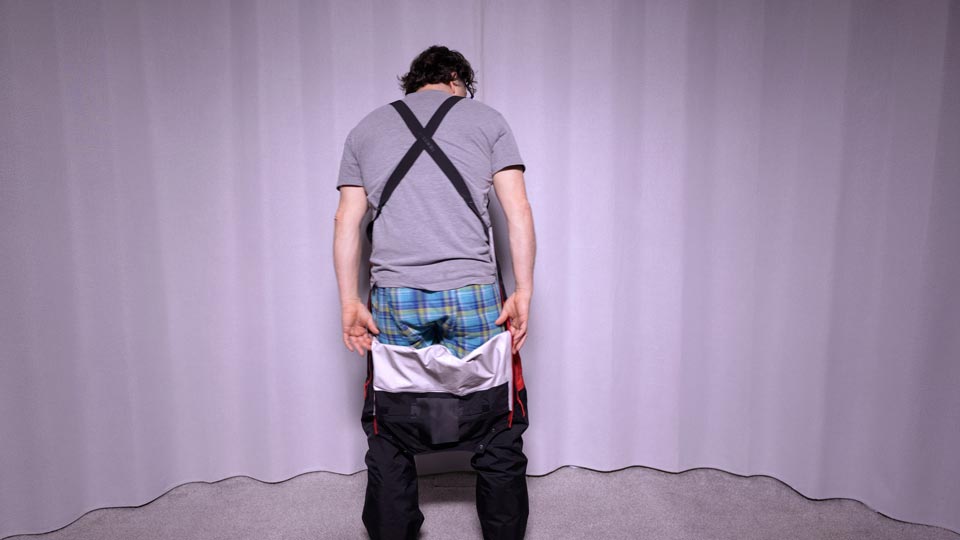 Waist adjustability is a loss, but this poop flap is a deal maker for me. I do not like bibs for this reason, and to have the ability to keep whatever you put on over the bib when it’s time to drop one out is exceptional. It makes backcountry drops before a drop less cold and uncomfortable. You also have a much easier time for a powder panicked morning porcelain drop before the lifts open.