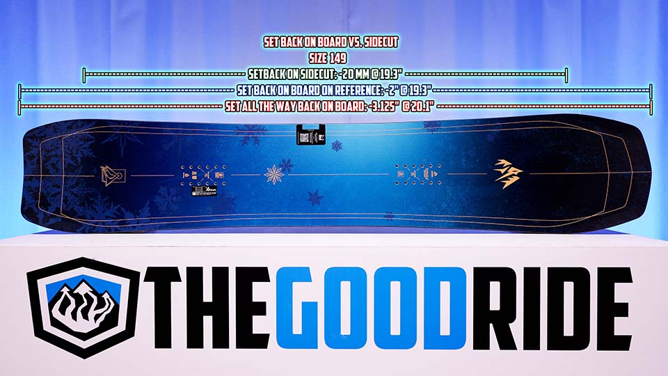 The Jones Womens Howler has a directional freeride shape that includes pretty significant taper of about eight millimeters. The Howler is set back on sidecut about two centimeters, and also set back on board at a reference stance of 19.3 about two inches. If you do set this back all the way to the furthest inserts, it increases your stance width a little bit to 20.1, but gives you 3.125 inches of extra nose.