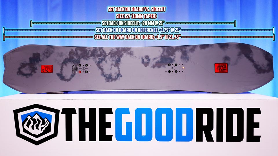The K2 Sky Pilot is tapered and directional. You have a much longer nose than you do tail. There are ten millimeters of taper, and with a -3.65″ setback on board all the way back, this steps it up versus the Commonwealth and the Passport. You get a more Freeride feel from this board.
