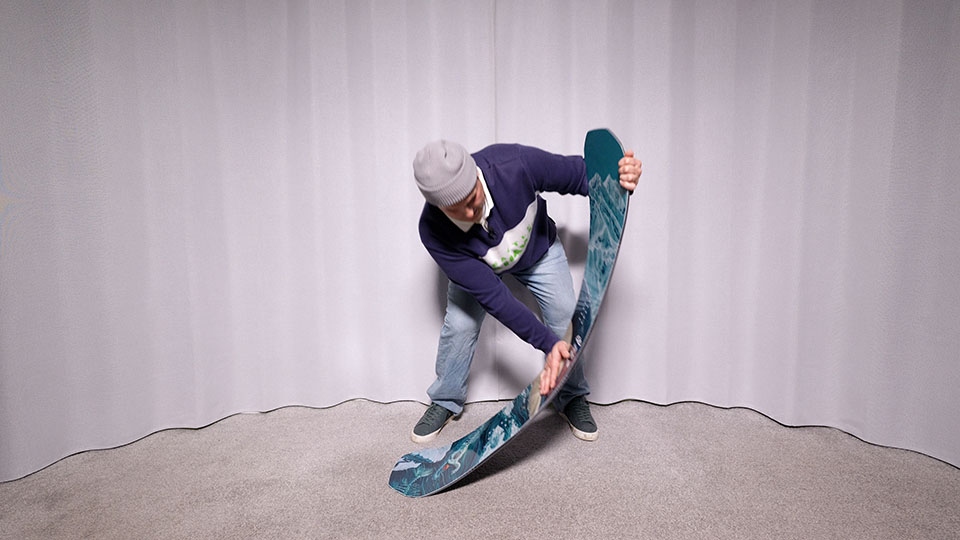 This is Lib Tech’s C2X camber. You got rocker in the middle with a mellow elliptical camber on the front foot that goes into some early rise. Then you have a shorter, higher camber on the back foot that also kicks up into some early rise. It makes for a very forgiving ride, but it does have a loose auto spinny feel when you’re one footing off the chair or flat basing.