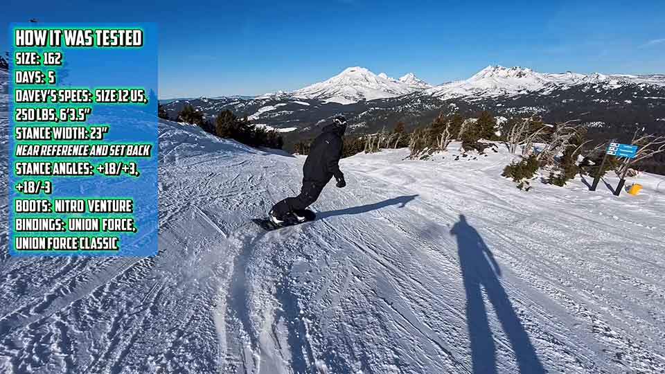 You know, it’s obviously not, designated Carver, but this board is a very competent turner. I had a lot of fun turning on this board, and when you get it on edge, the magne-traction really holds an edge very well through a turn. The camber profile bows and flexes you out of the out of a carve. Very enjoyable carving experience where you can lay a trench, come across the groomer and boost out of it going faster than you came into it. And this thing handled all different types of radius of turns, handled wide across the groomer turns really well did a good job on the medium radius turns,