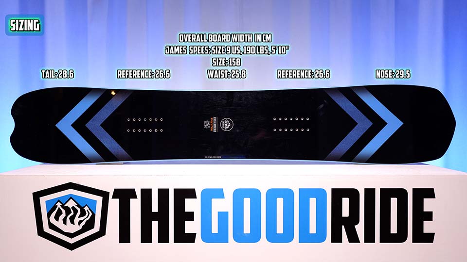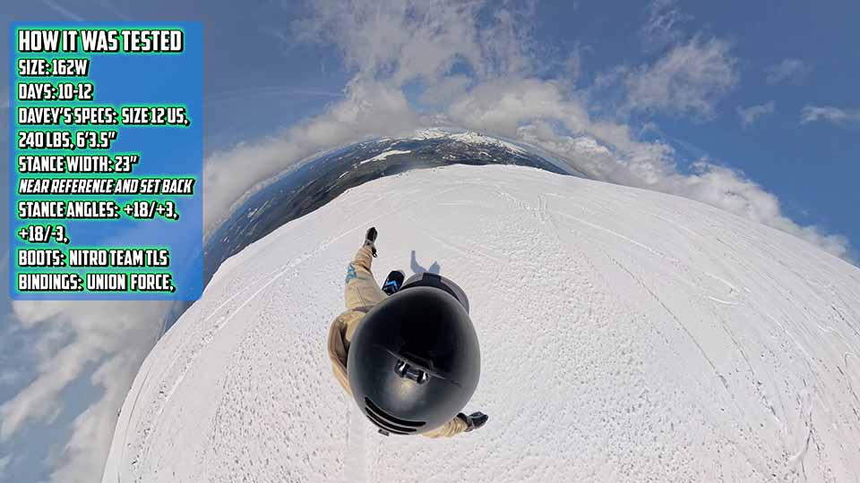 I rode this board on a 162 wide. I’m six, three and a half, 245. I rode it with size 12 Burton Ion Boots and size 12 Nitro Team TLS boots as well. I rode this board about 10 or 12 days this year in everything from medium deep powder, super deep powder, springtime conditions, and firm corduroy.