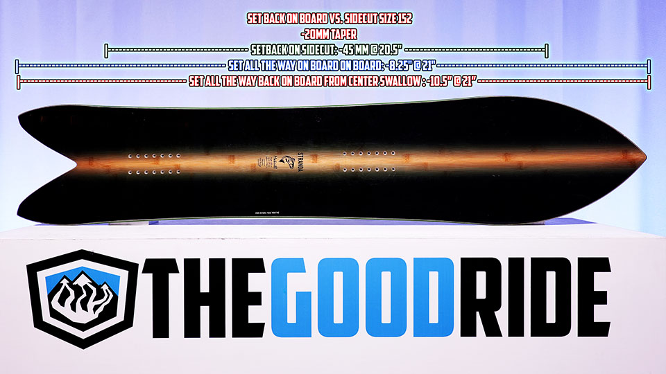 The Stranda Makril is pretty tapered and pretty directional, but not super tapered in the snow surf world. I think it’s only about 20 mil, but you can see it’s very set back on board.