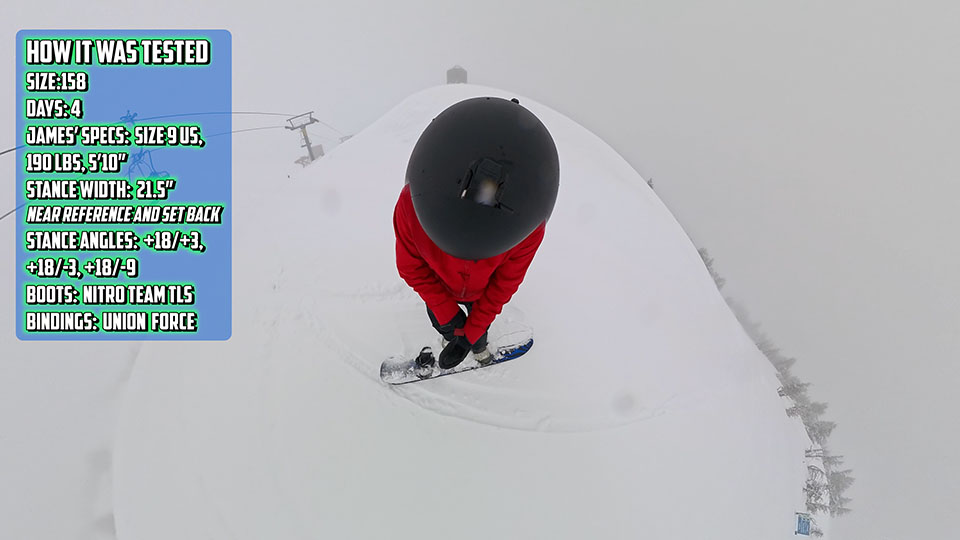 Turning in harder snow requires front-foot weighting in your turns, and that’s where this board shines. It’s best for a front foot weight turner, but in medium to soft snow, you can weight your turns any way you please, and you never feel that tapered, washy feel once you get past hard snow and into medium to medium soft. The spring out of the turn is really solid. It’s not the pop-iest or drive-iest of boards, but this stiffer flex really lets you hold the carve longer. When you put more speed and more strength, you really bend your knees, really flex this board into the carve. It really springs out well. Average riders like me would still have fun carving this, and it was very satisfying for me.