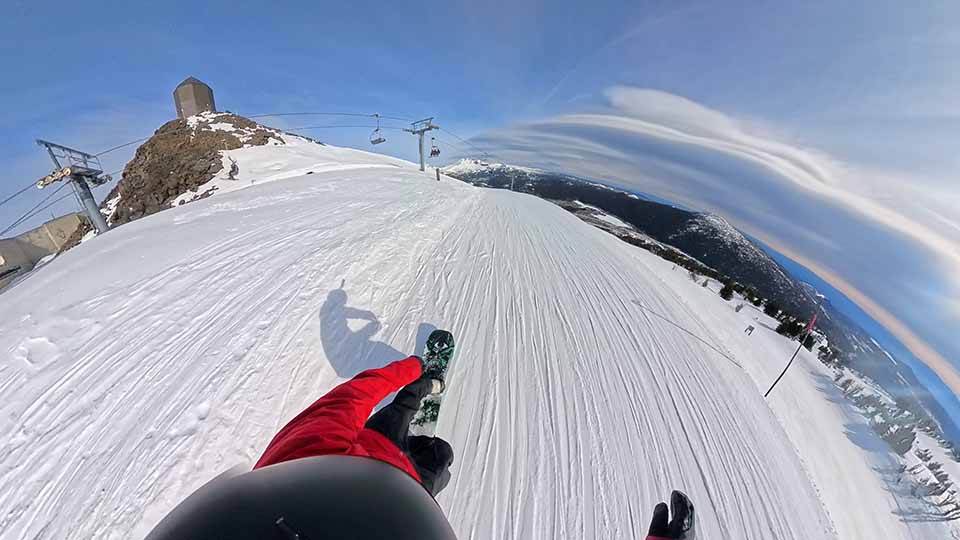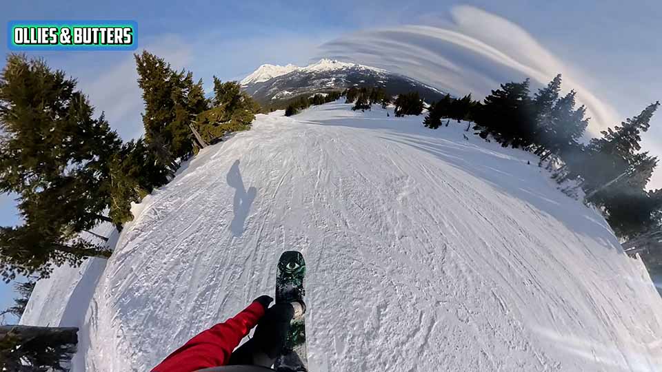 When getting air, this is not very set back on board, so there’s a lot of tail / landing gear, just in case you get off your game a little bit on a big air. You’re also centered on board in the air, and that’s a much better feeling than being way back on the tail, with some more directional tapered boards that lean on the more surfy side. Not bad pipe, but I like the Pick Your Line better for that. And pretty bad for jibbing, even worse now with the stiffer flex.