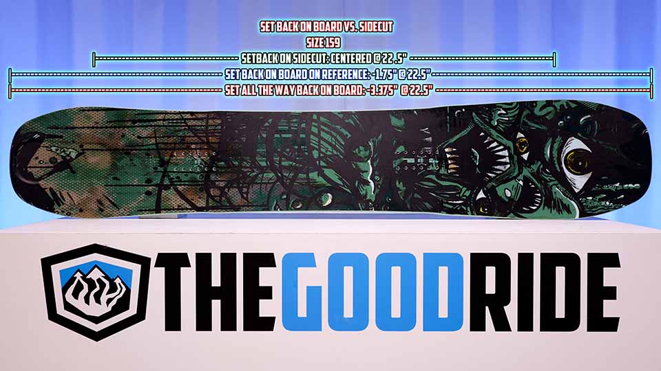 The YES Pick Your Line XTRM is pretty tapered and directional. There’s a lot more nose happening than the tail. It’s much more so than the Pick Your Line. This has 15mm of taper where the Pick Your Line’s at about -5.6mm of taper in the 159. What’s interesting though is this is centered on side cut versus -10 millimeters on side cut with the regular Pick Your Line. And that’s a rather taint freeing 22.5in wide stance width. When you factor in setback on board versus setback on side cut on reference stance, it’s 1.75in back from center of board. And then if you set it all the way back with a full size disc, you can get 3.375in back from center of board at the same 22.5in stance. So it has more set back on board than the Pick Your Line, but not as much as even the All In XTRM. However, the extra taper makes you feel like you’re more set back and more directional than the All In XTRM.
